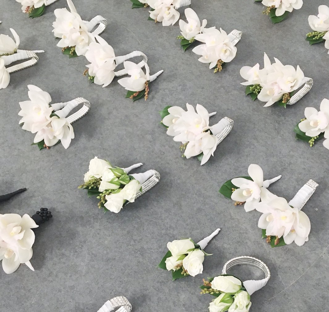 Usual flowers selected are: Polymin Orchids, Lisianthus or Spray Roses.